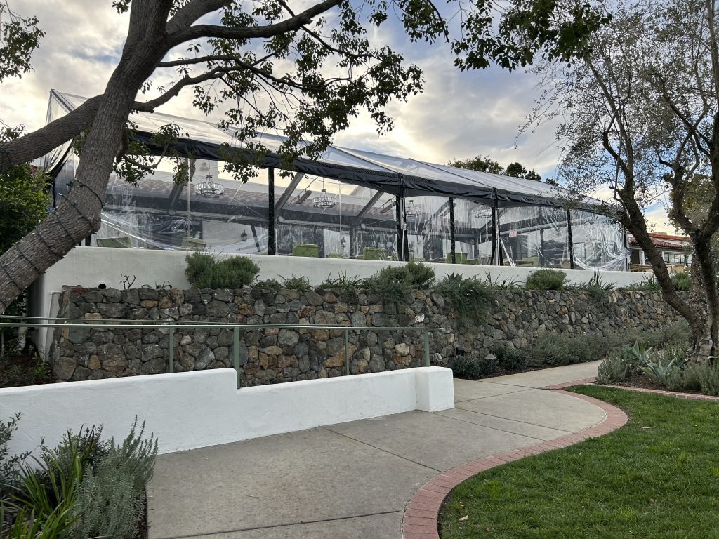 If you’re the Inn at Rancho Santa Fe, a permanent “temporary” plastic dining tent appears to be enjoying a long and happy life. Dark Skies? Less so. Every tree has been assigned a light and even the Inn’s tennis court is also now lit for nighttime play.